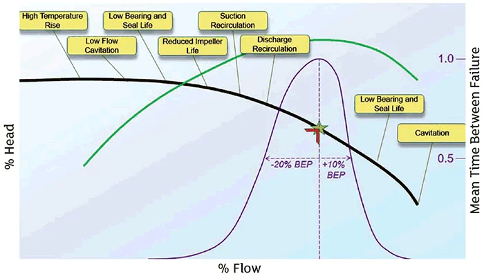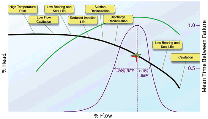 Using Image 2, the closer the pump is operated to its BEP, the greater the MTBF. As the operating flow rate of the pump moves farther to the left or right of the BEP, the failures occur more frequently.